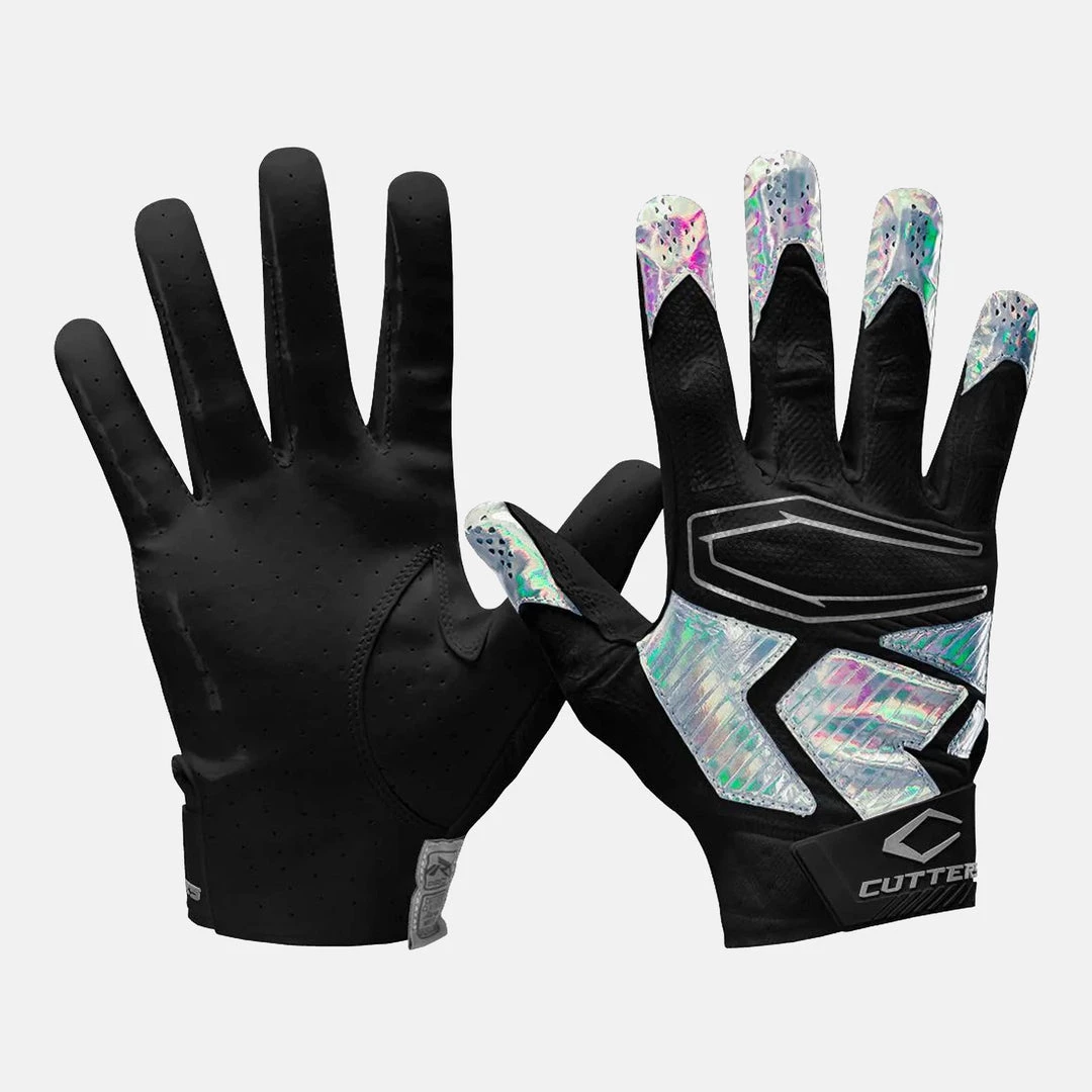 The exclusive Cutters Rev Pro 4. Iridescent Receiver Glove. This Cutters flagship Football Receiver Glove is used by elite pros every Sunday and features unmatched Air C-TACK grip, the original performance football grip that has set the standard for advanced grip innovation for over 20 years. Our newest Cutters receiver glove pushes the limit of stick on every catch and is perforated for better breathability and cooling performance. The best receivers in the world love the grip along with the exceptional combination of feel, support and stability, which deliver confidence that’s also very comfortable.