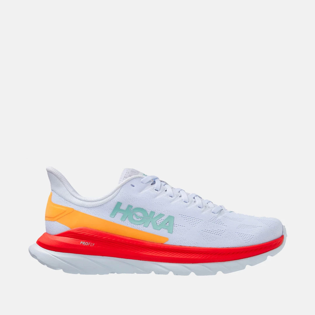 The Mach 4 running sneaker is designed for logging long miles. This everyday trainer delivers a lively ride and an energetic underfoot feel that is unquestionable Hoka. Softer and bouncier than the previous iteration, the Mach 4 employs a harmonious blend of foams – merging an incredibly soft, lightweight foam on top with rubberized foam directly beneath. This up-tempo shoe has been crafted with a new pull tab, revamped upper made from heat-pressed TPU embroidered yarns and a refined collar shape that alleviates pressure on the Achilles. Light, fast, and unquestionably responsive, the Mach 4 delivers a daily dose of speed.