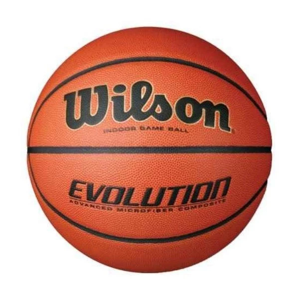 THE WILSON B0516 EVOLUTION BASKETBALL OFFICIAL SIZE: 29. 5 MICROFIBER COMPOSITE LEATHER COVER COMPOSITE AQUA-GRIP LAID-IN CHANNELS CUSHION CORE TECHNOLOGY NFHS APPROVED